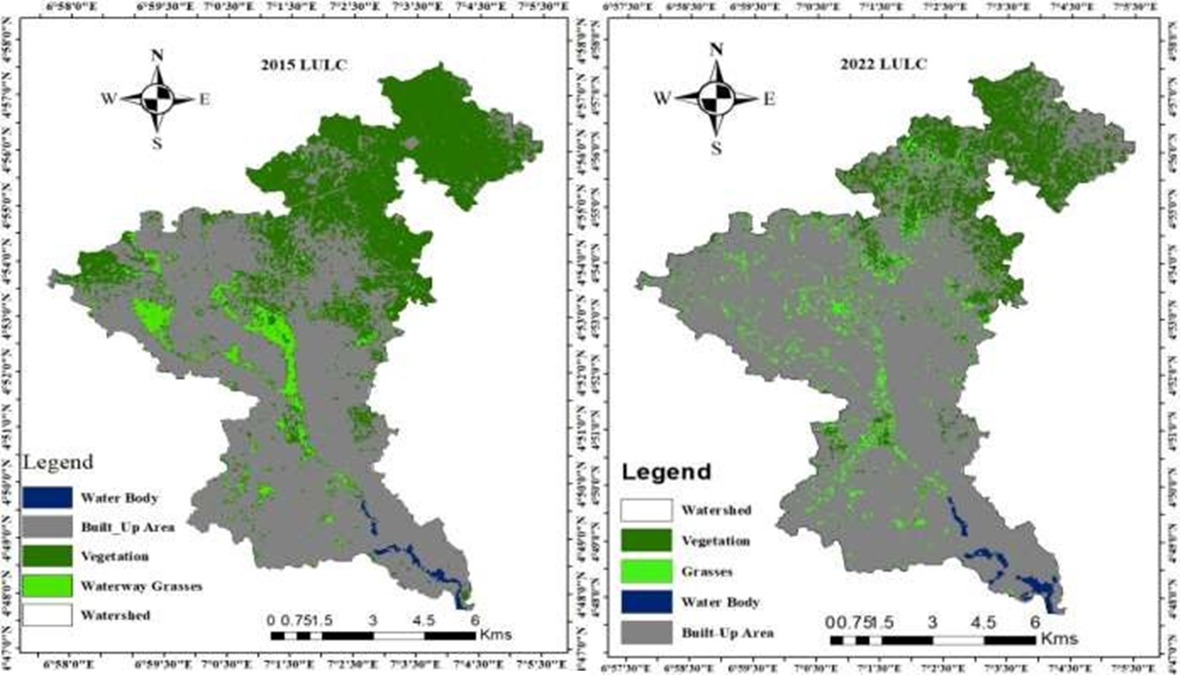 Figure 7: Land Use and Land Cover Change of Woji River Basin for 2015 and 2022