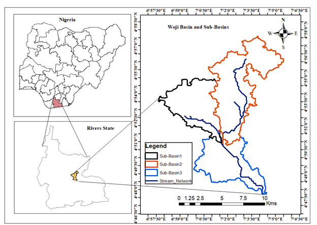The area, minimum, maximum, range, mean elevation and hypsometric integral of Woji basin and its sub-basins has been estimated and presented in Table 2