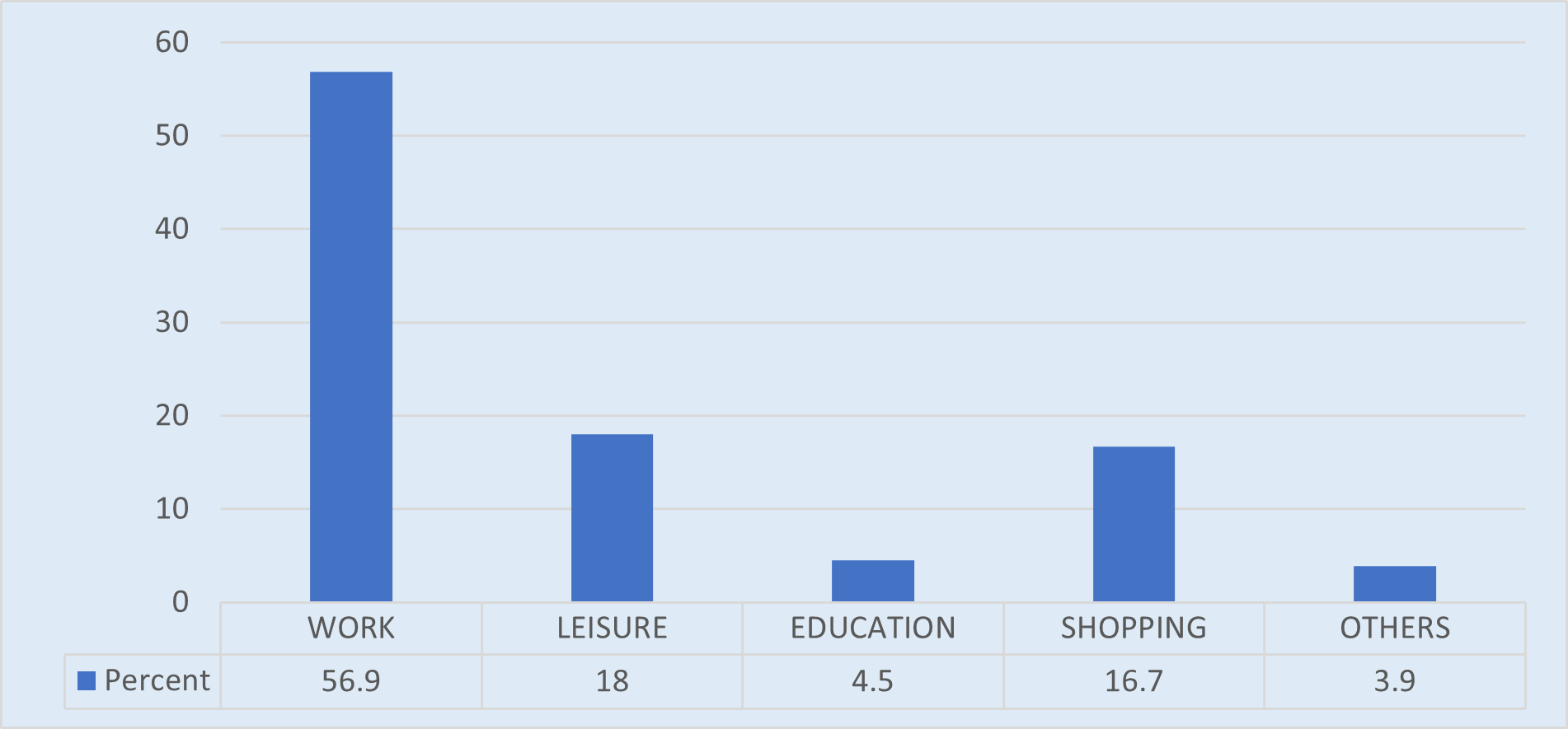 Figure 3 depicts that 65% of the respondents have travelled using water transport within the last six months, with Table 2 showing that 74.3% of the total respondents confirm they make at least 2 trips daily. This implies that the respondents have the required experience to provide the information required for this study. The purpose of the trips made by the respondents, as presented in Figure 4, revealed that most respondents travel by water transport to get to their places of work, while 18% travel by water for leisure, which gives credence to the fact that water transport aids tourism. These figures are likely to increase should there be an improvement in the waterway facilities. Education and Shopping are also other significant reasons for which the respondents use water transport, as students and residents in riverine areas go to school or shop across the waterways.