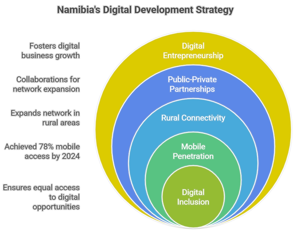 Namibia’s digital transformation efforts emphasize the importance of digital inclusion and rural connectivity, reflecting the country’s commitment to reducing spatial inequalities. The government’s Digital Transformation Center, supported by international partnerships, focuses on creating enabling environments for digital entrepreneurship and innovation. Recent initiatives include efforts to leverage digital technologies for sustainable development, particularly in natural resource management and renewable energy sectors.
