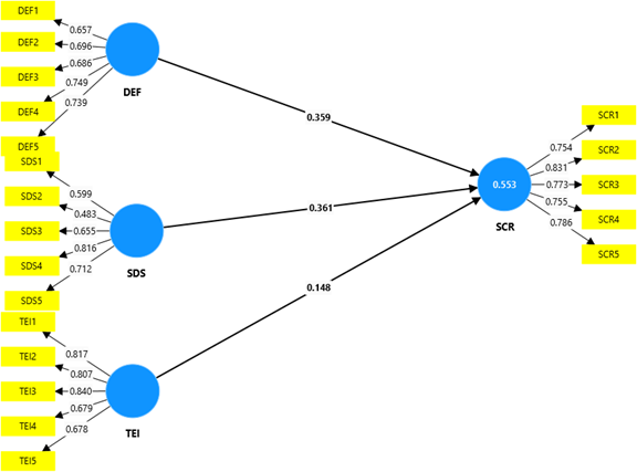 The outer loadings of the items were examined, revealing that most constructs (DEF, SCR, and TEI) had acceptable loadings above 0.7, signifying strong representation. However, SDS exhibited variability, with some items showing lower loadings (e.g., SDS2:0.483), suggesting areas for potential refinement.