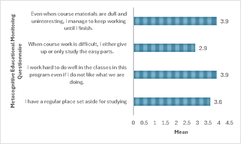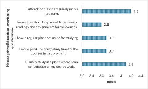 In analyzing learners’ perceptions of their behavior in learning, measured through metacognitive self-regulation, it’s evident that students employ various strategies to enhance their comprehension and engagement. Among the 11 items surveyed as mentioned in Graph 8, certain practices stand out with notably higher mean scores, indicating their prominence in students’ learning approaches. Particularly noteworthy is the practice of reflecting on and addressing confusion when encountered during reading (mean = 3.8), demonstrating a proactive effort to clarify understanding. Similarly, the tendency to determine and address comprehension gaps in studied concepts (mean = 3.8) underscores students’ commitment to monitoring and enhancing their learning process. Additionally, the habit of setting goals for study sessions (mean = 3.7) reflects students’ proactive approach to directing their learning activities, ensuring a structured and purposeful study experience. Conversely, the item with the lowest mean score, indicating relatively less emphasis, pertains to missing important points during class due to distractions (mean = 3.1). While still above the midpoint, this suggests a lesser occurrence of such distractions compared to other metacognitive strategies. These findings highlight the importance of metacognitive self-regulation in students’ learning behaviors, emphasizing the role of reflective practices, goal-setting, and continuous monitoring in fostering effective learning outcomes.