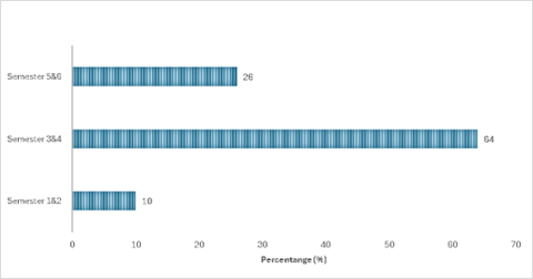 Graph 3 illustrates the distribution of respondents based on year of study. The highest percentage, 64% situated in semester 3 and 4 (year 2), followed by second highest percentage, 26% in semester 5 and 6 (year 3) and the lowest percentage, 10% in semester 1 and 2 (year 1). In general, the findings provide an overview of the demographic profile and academic background of survey respondents, enhancing comprehension of their point of views and experiences within the study’s environment.