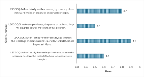 Graph 5 shows the mean scores for four (LSCCOQ1- LSCCOQ4) different study organization methods practices by respondents. From the analysis, the highest mean score of 3.9 reflects the frequency of going through readings and notes to find important concepts (LSCCOQ 2). This followed by approach of outlining important concepts from class notes indicates a common practice with a mean score of 3.8 (LSCCOQ4). Next, a mean score of 3.6 for organizing their thoughts by outlining course readings (LSCCOQ1) and the lowest mean score of 3.5 suggests less frequent use of charts, diagrams, or tables to organize materials (LSCCOQ3).