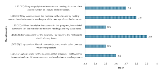 Graph 6 shows the mean scores for six (LSCCEQ1 – LSCCEQ16) different elaboration components investigated in this study. The highest mean score of 3.9 indicates that relating new material to existing knowledge (LSCCEQ3) is a well-adopted approach. The second highest mean score is 3.8 which if for understanding the material in the classes by making connections between the readings and the concepts from the lectures (LSCCEQ5). Followed by (LSCCEQ5) which is apply ideas from course readings in other class activities such as lecture and discussion approach with mean score of 3.7. Meanwhile, the approach of integrating information from various sources like lectures, readings, and discussions (LSCCEQ1) has a mean score of 3.6. Lastly, there are two approaches which were relating ideas across different subjects (LSCCEQ2) and writing brief summaries of main ideas from readings and class notes (LSCCEQ4) share the same mean score of 3.5, indicating it might be less utilized or effective and could imply room for improvement or varying levels of adoption. However, the overall trend of mean score for elaboration strategy indicates a positive engagement with elaborative learning techniques.