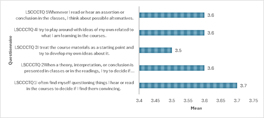 Graph 7 shows the mean scores for five (LSCCCTQ 1- LSCCCTQ 5) critical thinking components investigated in this study. From the analysis, the approach of questioning information to assess its persuasiveness (LSCCCTQ 1) has the highest mean score of 3.7. Followed by evaluating supporting evidence for theories or conclusions presented in classes or readings (LSCCCTQ 2), playing around with personal ideas related to course learning (LSCCCTQ 4) and thinking about possible alternatives to assertions or conclusions in classes (LSCCCTQ 5) with shows the same mean score of 3.6. Lastly, for idea development approach where required development one’s own ideas from course materials (LSCCCTQ 3) has the lowest mean score of 3.5, which indicate it might be less practiced. Overall, the scores of critical thinking approaches range from 3.5 to 3.7, reflecting a moderate level of engagement with critical thinking approaches. The data suggests that while there is a consistent application of these strategies, which may be opportunities to enhance their utilization and effectiveness within the program.