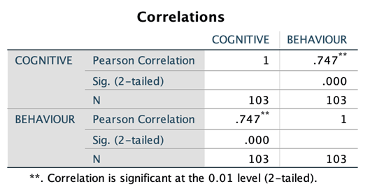 Table 2 shows there is an association between cognitive and behaviour. Correlation analysis shows that there is a high significant association between cognitive and behaviour (r=.747**) and (p=.000). According to Jackson (2015), coefficient is significant at the .05 level and positive correlation is measured on a 0.1 to 1.0 scale. Weak positive correlation would be in the range of 0.1 to 0.3, moderate positive correlation from 0.3 to 0.5, and strong positive correlation from 0.5 to 1.0. This means that there is also a strong positive relationship between cognitive and behaviour.
