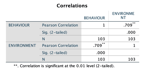Table 3 shows there is an association between behaviour and environment. Correlation analysis shows that there is a high significant association between behaviour and environment (r=.709**) and (p=.000). According to Jackson (2015), coefficient is significant at the .05 level and positive correlation is measured on a 0.1 to 1.0 scale. Weak positive correlation would be in the range of 0.1 to 0.3, moderate positive correlation from 0.3 to 0.5, and strong positive correlation from 0.5 to 1.0. This means that there is also a strong positive relationship between behaviour and environment.