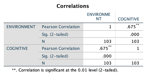 Table 4 shows there is an association between environment and cognitive. Correlation analysis shows that there is a high significant association between environment and cognitive (r=.675**) and (p=.000). According to Jackson (2015), coefficient is significant at the .05 level and positive correlation is measured on a 0.1 to 1.0 scale. Weak positive correlation would be in the range of 0.1 to 0.3, moderate positive correlation from 0.3 to 0.5, and strong positive correlation from 0.5 to 1.0. This means that there is also a strong positive relationship between environment and cognitive.