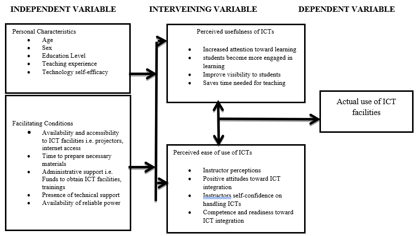 In application of the TAM to the use of ICT in teaching, the model suggests that instructors’ use of ICT in teaching may be predicted by their perceived ease of use and perceived usefulness of ICT facilities. Instructors’ perceived ease of use (e.g. confidence, positive attitude toward the technology) and perceived usefulness (e.g. increased attention by the students; students becoming more engaged in learning) of ICT facilities may be influenced by their individual differences (age, sex, teaching experience, education level (rank), technology self-efficacy); facilitating conditions i.e. availability and accessibility of ICT facilities like computers, projectors, internet access etc., time to prepare necessary materials, administrative support like regular trainings, provision of funds. Both perceived use and perceived ease of use influence actual use of the ICT facilities by the instructors in teaching and learning process.