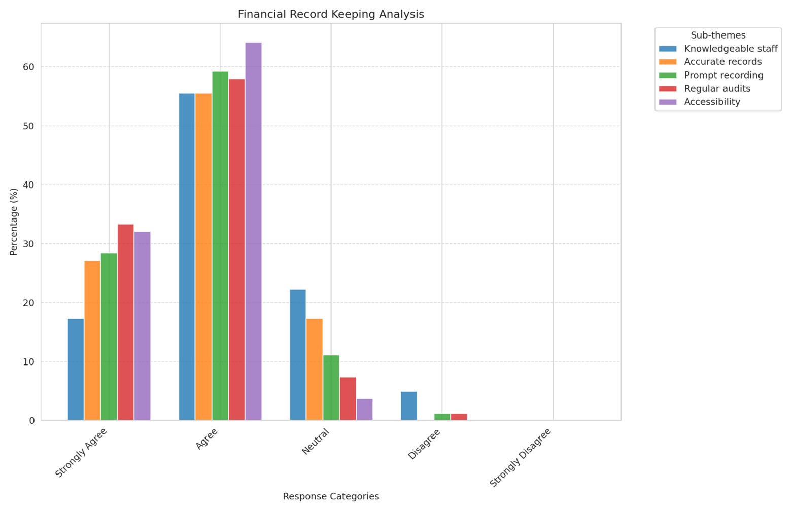The findings suggest that primary schools in Kilifi generally maintain solid financial record-keeping practices, including easy access to records, regular audits, and timely transaction entries. However, there is room for improvement in enhancing staff expertise in financial record keeping, as only a small percentage strongly agree that their schools have highly knowledgeable personnel in this area.