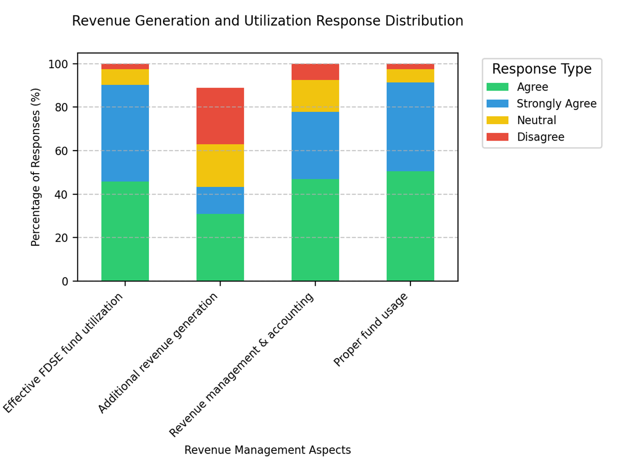 The commitment to fiscal discipline is evidenced by 87.8% of schools closely adhering to their approved budgets throughout the academic year, while 82.9% maintain well-documented financial plans to guide their management practices. This systematic approach to financial management suggests a strong foundation for sustainable school operations and resource allocation. However, despite these positive indicators, there remain opportunities for enhancement in certain areas. The presence of neutral responses ranging from 4.9% to 12.2% across various aspects of financial management, along with a small percentage (1.2-2.4%) of negative responses, indicates room for improvement. Particularly, the slightly higher neutral responses (12.2%) regarding well-documented financial plans suggest this as a potential area for focused development.