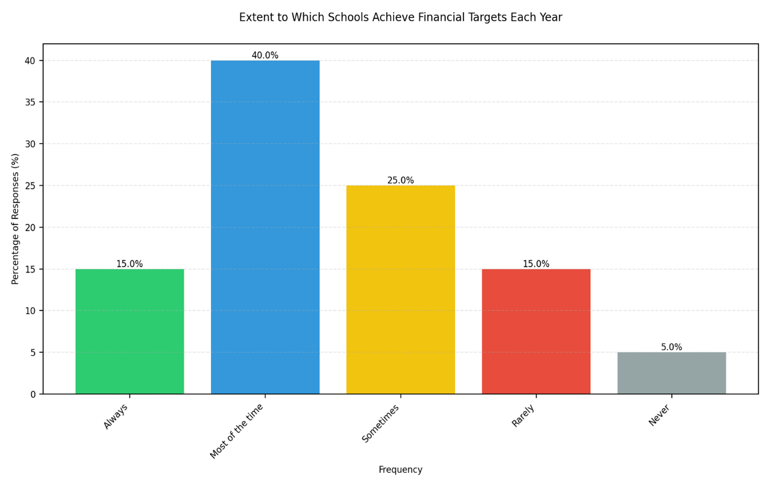 - Achievement of Financial Targets: While many schools regularly meet their financial targets, some struggle due to factors like insufficient funding, delayed fund disbursements, and high operational costs. This reveals the need for enhanced financial planning and diversification of income sources to sustain financial health.