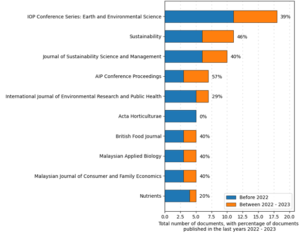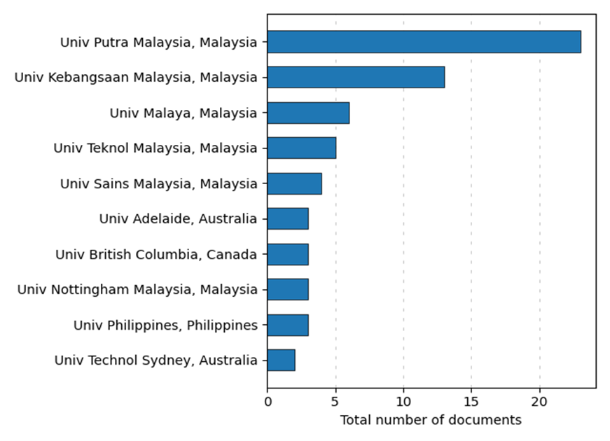 The analysis of the data presented in Figure 7 indicates that Malaysian universities, particularly Universiti Putra Malaysia, Universiti Kebangsaan Malaysia, Universiti Malaya, Universiti Teknologi Malaysia, and Universiti Sains Malaysia, have been at the forefront of food security research, demonstrating the strong emphasis and scholarly output from these institutions in this field. Based on data in Figure 8, Universiti Putra Malaysia (UPM) in Malaysia stands out as the leading institution, with the highest total number of publications at around 23 documents. This indicates UPM’s significant contributions to research in the field of food security. Universiti Kebangsaan Malaysia (UKM), another Malaysian university, also has a substantial number of publications, around 13, demonstrating its strong commitment and research output related to food security. Universiti Malaya (UM), an additional prominent Malaysian institution, has 6 publications on food security research, further highlighting the research focus on this topic within Malaysia. Universiti Teknologi Malaysia (UTM) has around 5 publications in the domain of food security, reinforcing the strong emphasis on this area of research within the Malaysian university landscape. Universiti Sains Malaysia (USM) also contributes significantly, with about 4 publications related to food security, solidifying its position as one of the key contributors from Malaysia. While the figure shows contributions from other institutions, such as the University of Adelaide in Australia, the University of British Columbia in Canada, the University of Nottingham Malaysia, the University of the Philippines, and the University of Technology Sydney in Australia, their publication counts are lower compared to the leading Malaysian universities.