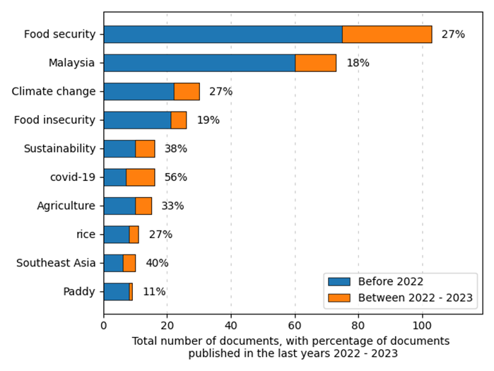 This study employs ScientoPy to analyse the authors’ keywords and examine the prevailing research trends and intriguing topics in food security. Based on figure 4, the most common research topics in this field revolve around food security, sustainability, and regional dynamics, particularly in Malaysia and Southeast Asia, which collectively reflect critical global and regional challenges. Food security is the most dominant theme, with 27% of related publications emerging between 2022 and 2023, emphasizing its ongoing importance. In specific research, Malaysia accounts for 18% of recent studies, highlighting a sustained focus on localized food and agricultural issues. Climate change, another major area, aligns with 27% of recent publications, signifying its impact on agriculture and food systems. Closely related to food security, food insecurity highlights access and affordability challenges, with 19% of studies being recent. Sustainability has also gained traction, with 38% of its research published recently, underscoring efforts to balance environmental and economic priorities. COVID-19 remains a standout topic, with 56% of recent studies exploring its disruption of food systems, supply chains, and agriculture. Agriculture, a foundational field, accounts for 33% of recent publications, while rice, a staple crop, holds 27%, reflecting its critical role in food security. Research on Southeast Asia (40% recent publications) emphasizes regional strategies to tackle these issues, while paddy, though less studied, shows emerging interest (11% recent publications) in addressing cultivation challenges. Overall, the field reflects a mix of urgent, global-scale topics like climate change and COVID-19, alongside region-specific and crop-focused studies that are essential for countries heavily reliant on rice-based economies.