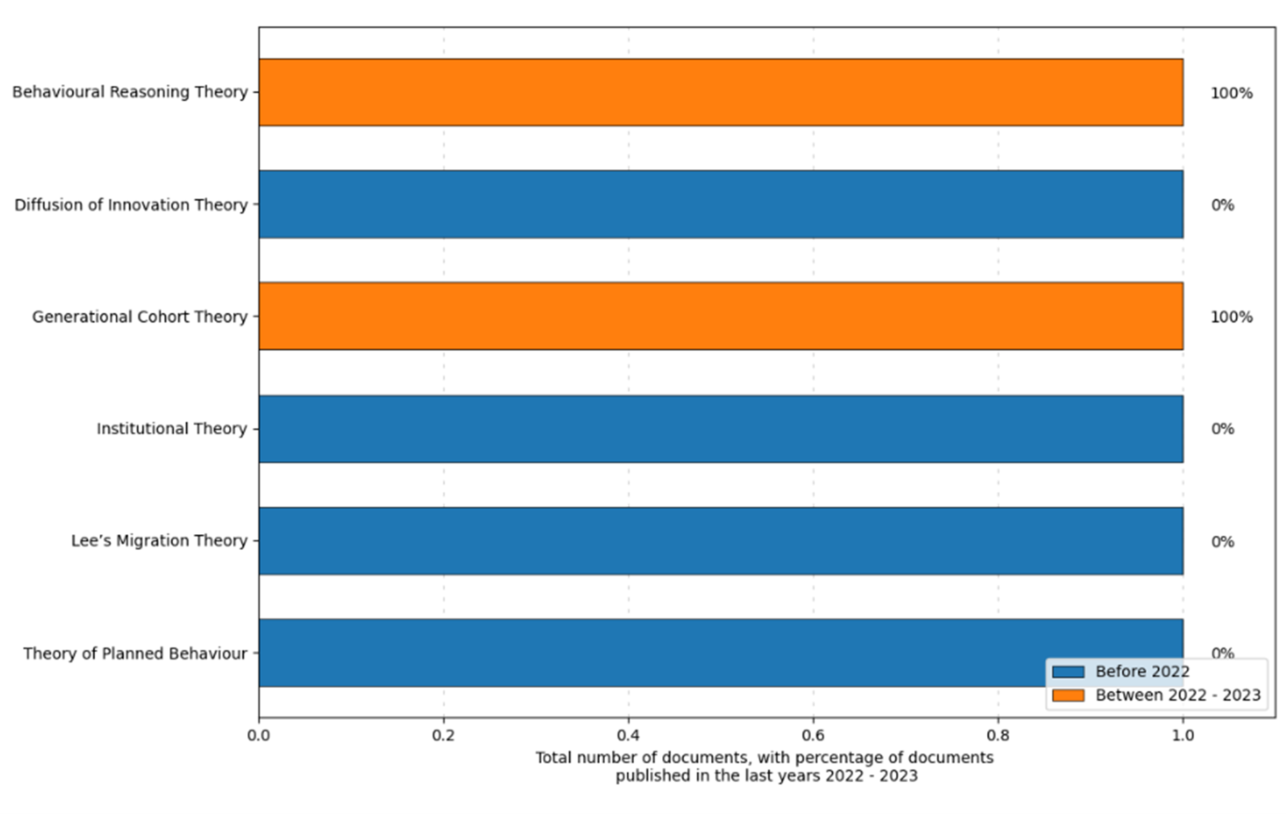 Based on Figure 5, the study shows that Behavioural Reasoning Theory is the most prominent, accounting for 100% of documents published in 2022-2023. This theory explains that people’s intentions and actions are shaped by their reasons for behaving a certain way. Similarly, Generational Cohort Theory also appears in 100% of recent publications. This theory suggests that people from the same generation share similar values, beliefs, and experiences that influence their behaviour and decisions. In contrast, Diffusion of Innovation Theory and Institutional Theory have received little attention in food security research, with a 0% presence in recent publications. Diffusion of Innovation Theory looks at how new ideas and technologies spread in society, while Institutional Theory examines how institutions and policies affect behaviour. Institutional Theory is particularly important for food security because it analyses how organizations and rules impact food production, distribution, and access. For example, good governance can help improve food supply chains, while failures in institutions can lead to food insecurity due to poor resource allocation or corruption. Research using Institutional Theory has shown its value in tackling food security issues. Studies have explored how changes in agricultural policies can improve food availability and how local governance can help communities become more resilient to climate-related food shortages. These findings highlight the importance of understanding how institutions affect food systems. While Behavioural Reasoning Theory focuses on individual choices, Institutional Theory adds depth by considering the broader structural factors that influence those choices. For instance, decisions about food consumption are affected not only by personal preferences but also by factors like food prices and government health campaigns. By combining these theories, researchers can gain a better understanding of how individual actions and systemic issues work together in achieving food security. In this case Incorporating Institutional Theory with Behavioural Reasoning Theory and Generational Cohort Theory would create a more comprehensive approach to addressing food security challenges. Future studies should investigate how Institutional Theory can illuminate the role of governance and policies in building resilient food systems. Meanwhile, Lee’s Migration Theory and the Theory of Planned Behaviour have not been emphasized in recent research, each showing a 0% presence. Overall, the figure indicates that Behavioural Reasoning Theory and Generational Cohort Theory are the leading frameworks in current food security research, while other theories have been less highlighted.