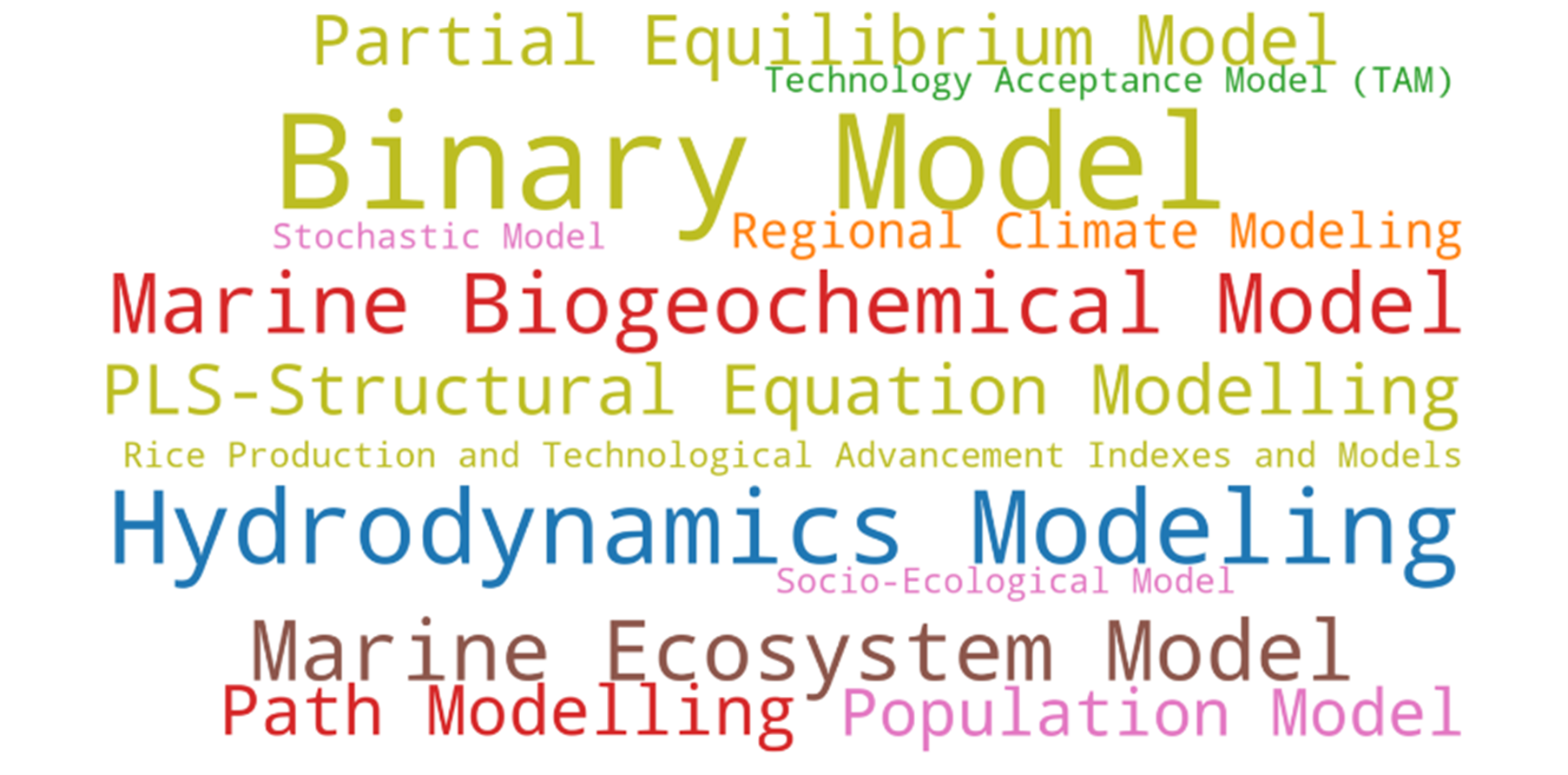 Meanwhile, Figure 6 reveals that the binary model constitutes a significant portion of the research, with a high percentage of documents published in the last years (2022-2023). Hydrodynamics modelling also has a substantial presence in recent food security research. Marine biogeochemical models and marine ecosystem models, related to the marine environment, are important components of the research. PLS-Structural Equation Modelling, a statistical modelling technique, is utilized in a notable percentage of the recent publications. The research also incorporates the Partial Equilibrium Model and Path Modelling, albeit to a lesser extent than the previously mentioned approaches. The food security research incorporates the Population Model and Regional Climate Modelling, which concentrate on population dynamics and regional climate patterns. Specific models and indexes related to rice production and technological advancement are a significant part of the research. The Socio-Ecological Model, which considers the interplay between social and ecological factors, is also utilized in the food security studies. A stochastic model, a type of probabilistic modelling, was employed in a portion of the recent publications. The Technology Acceptance Model (TAM), which examines the adoption of technologies, is also present in the food security research landscape. The figure also indicates a diverse array of modelling approaches employed in food security research, with a strong emphasis on binary, hydrodynamic, and marine-related models, as well as statistical and population-focused techniques. The research also highlights the importance of rice production, technological advancements, and socio-ecological considerations in the field of food security.