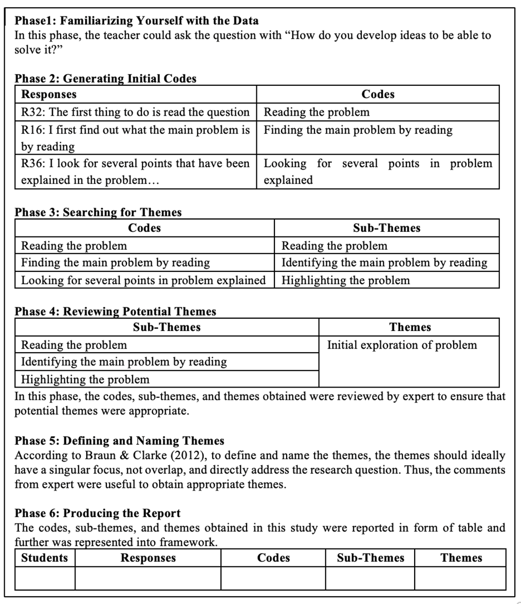 To analyse the qualitative data, this study used thematic analysis by [25]. Thematic analysis technique has been used by previous researchers to understand the process (though process and cognitive process) [26]-[27]. Thematic analysis was used to analyse data from Think Aloud Protocol and Interview Protocol because both produce qualitative data. In Think Aloud Protocol, thematic analysis helps identify themes in the creative process of students. While in Interview Protocol, this analysis was used to find the main themes in the participants’ responses that describe scientific creativity process after using the module. Both types of protocols can provide in-depth insights through the identification of recurring codes and themes, making thematic analysis very suitable for analyzing qualitative data. Thematic analysis consists of 5 phases namely: Phase1: Familiarizing Yourself with the Data, Phase 2: Generating Initial Codes, Phase 3: Searching for Themes, Phase 4: Reviewing Potential Themes, Phase 5: Defining and Naming Themes, and Phase 6: Producing the Report. The following is example of how thematic analysis was conducted.