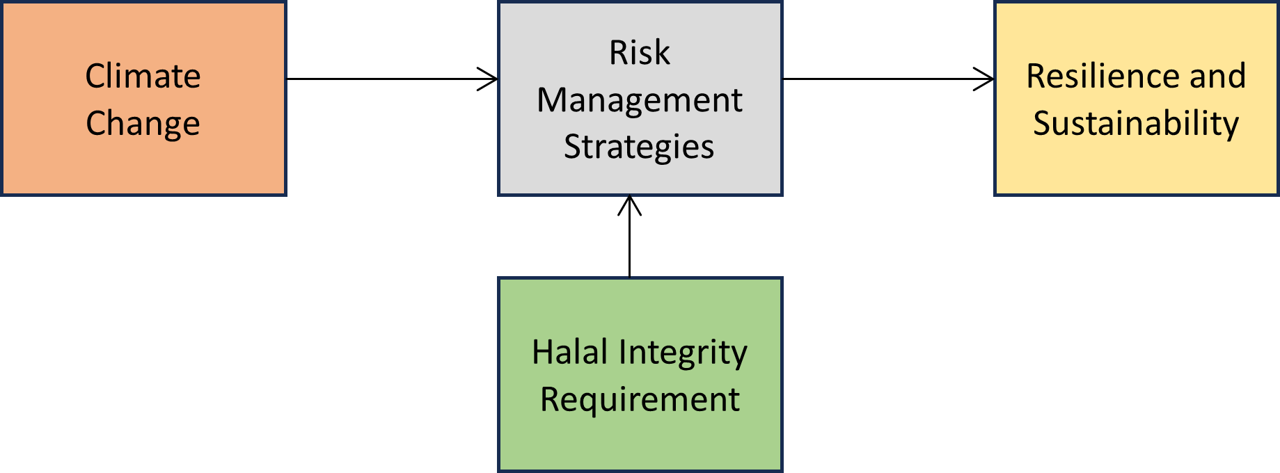 This research builds on the theory of supply chain risk management (SCRM), which focuses on identifying, assessing, and reducing risks that may disrupt supply chain activities (Tang & Musa, 2011). Risk management in supply chains (SCRM) is a crucial element in addressing the risks posed by climate change. Consideration of farming systems under the current context includes the approach of climate-smart agriculture (CSA), which promotes CSA practices that optimise productivity, resilience, and adaptation to yield gaps created through climate change (FAO, 2013). The theoretical integration of Tamayo, Mack, and Tseng for constructing a risk management framework in halal agriculture supply chains enable to unfolds in which contexts and situations is climate resistant in academic discourse among different halal agriculture stakeholders. The relationship between climate change and risk management framework variables in halal agriculture supply chain consists of independent variable (IV), dependent variable (DV), mediator, and moderator. Climate change serves as the independent variable, and indicates outer factors like floods, droughts, and temperature extremes that generate risks for halal agriculture supply chains. The aforementioned risk factors in turn shape the necessity of appropriate risk management techniques. In this framework, risk management strategies practices inherited from Supply Chain Risk Management (SCRM) and Climate-Smart Agriculture (CSA) become the mediator. The dependent variable under research is resilience and sustainability of halal agriculture supply chains, and the relationship between climate change and dependent variable in this model is mediated by the suggested frameworks. SCRM, which includes CSA practices, from flood-proofing infrastructure, water-efficient irrigation, crop diversification, and so forth can help mitigate some negative effects of climate change and work towards greater resilience and sustainability. The moderator in the model is halal integrity requirements, which affect the effectiveness of the risk management strategies. Halal integrity means all things adhere to Islamic ethics, such as avoiding contamination and ensuring that all animals are treated humane. On top of this moderating variable, so that not only climate-related risks are managed but also halal certification and the credibility of the supply chain are maintained. These factors collectively form a holistic approach for tackling the impacts of climate change on halal agricultural supply chains.