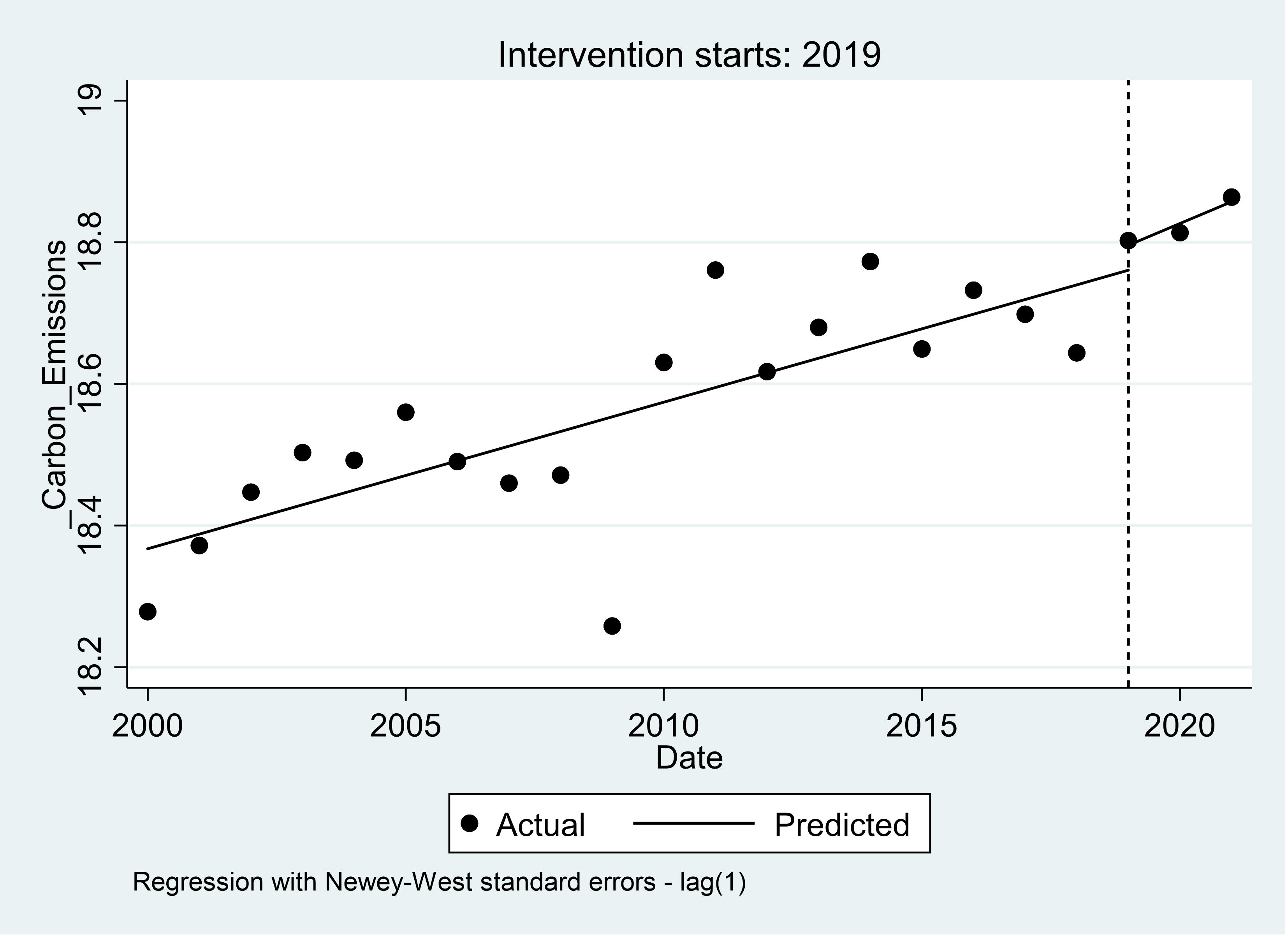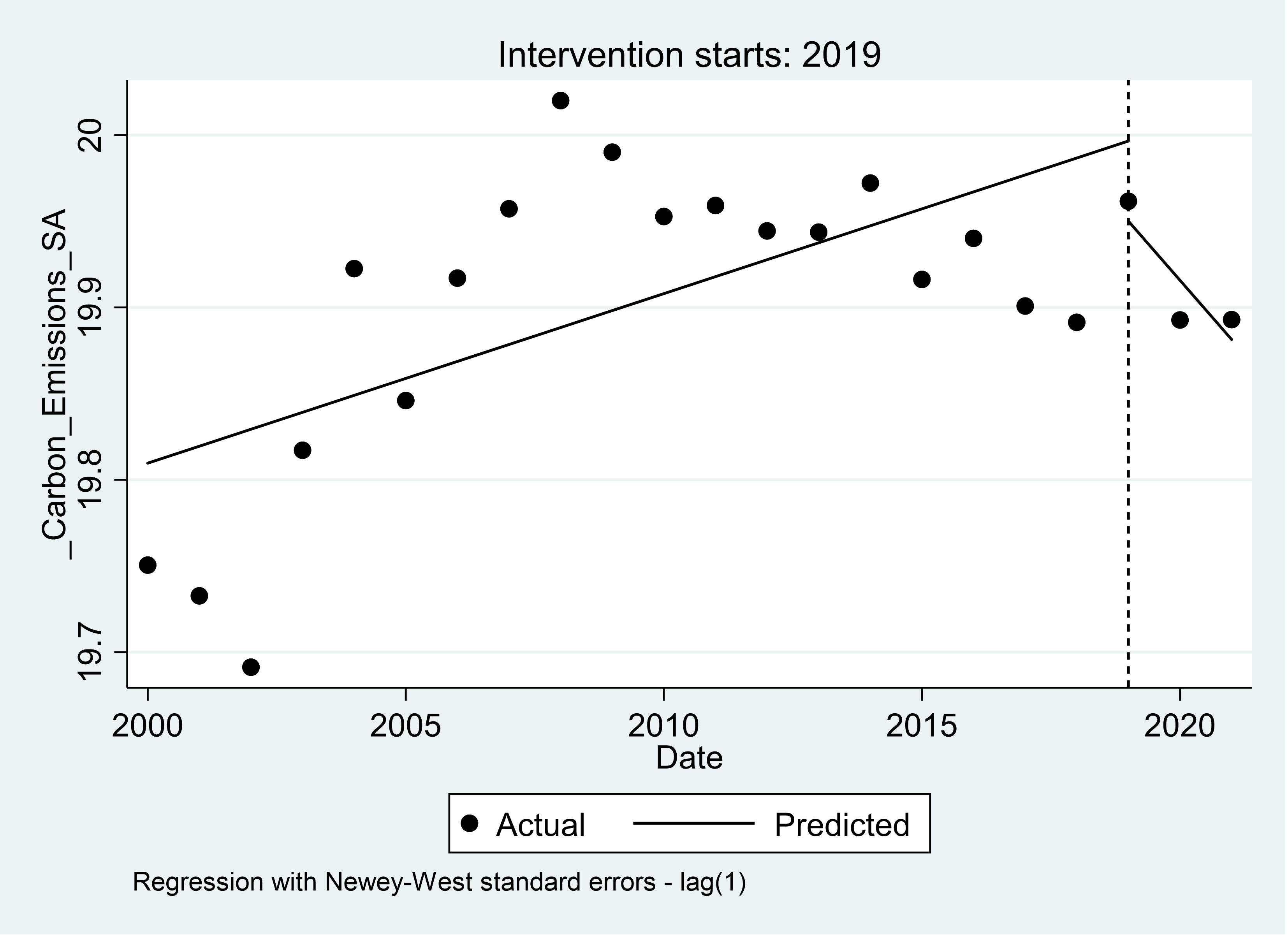 In the first year of the implementation of the carbon tax, there appears to be a reduction of 4.64 percent in carbon emission in South Africa. This is regarded as the short-term effect of the carbon tax on carbon emission, but this reduction is not significant at the 10 percent significance level. This can possibly be explained by the COVID-19 pandemic, which resulted in decreased energy demands, which subsequently resulted in reduced emissions. The long-term effect of the carbon tax has resulted in a 4.42 percent significant decrease in carbon emissions in South Africa. Overall, the post-intervention (carbon tax) trend decreased yearly carbon emissions by 3.43 percent. Figure 5 provides a visual display of these results.