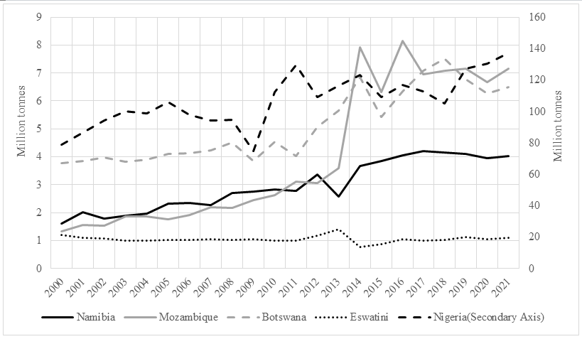 The carbon emissions data for South Africa, Mozambique, Namibia, Botswana, Nigeria and Eswatini were sourced from Ritchie and Roser (2021) at https://ourworldindata.org/co2-and-greenhouse-gas-emissions