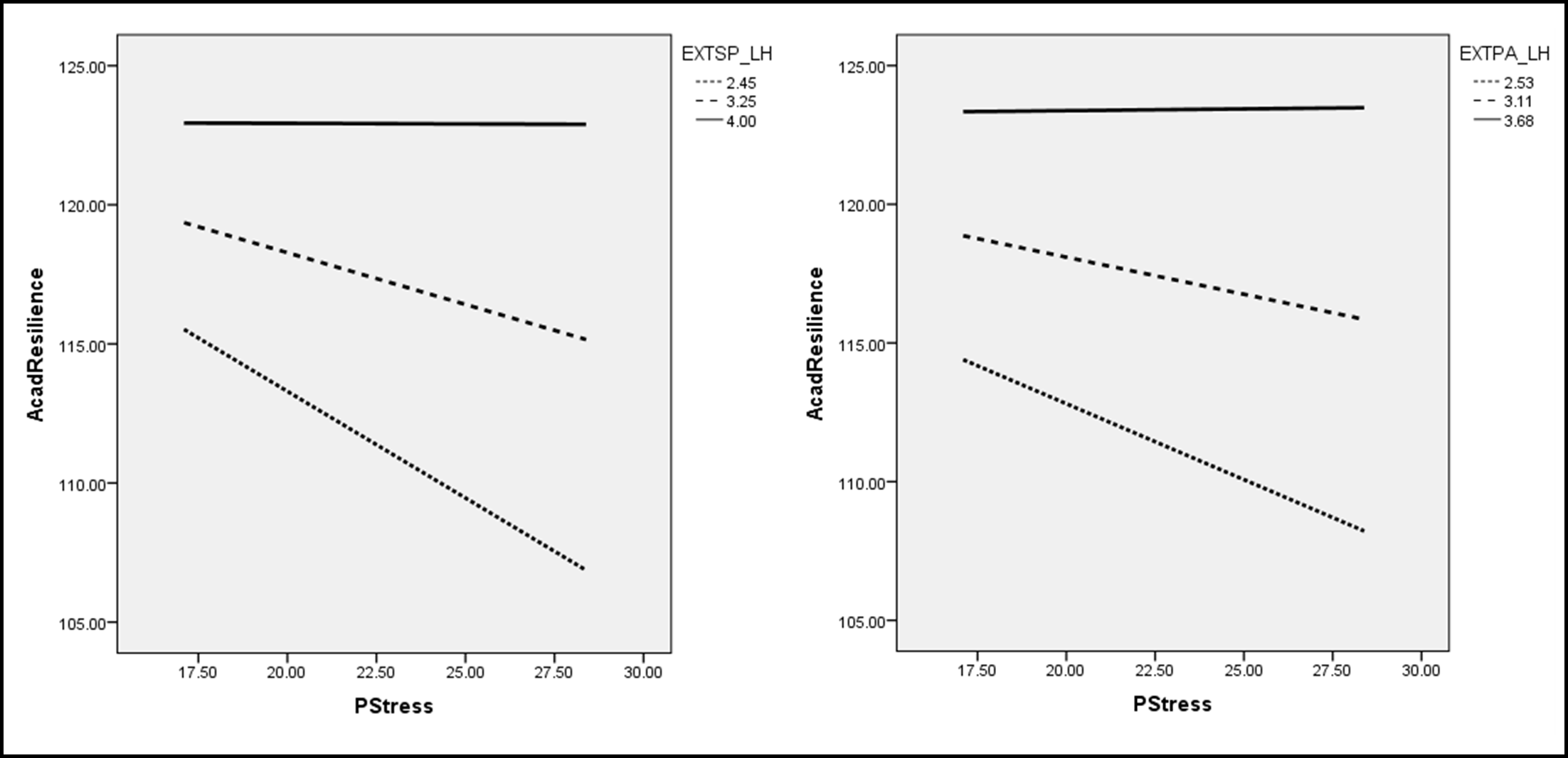 Figure B. On the left, External – Spiritual Being Locus of Hope as a moderator of the relationship between Perceived Stress and Academic Resilience. On the right side, External – Family Locus of Hope as a moderator between the relationship between Perceived Stress and Academic Resilience